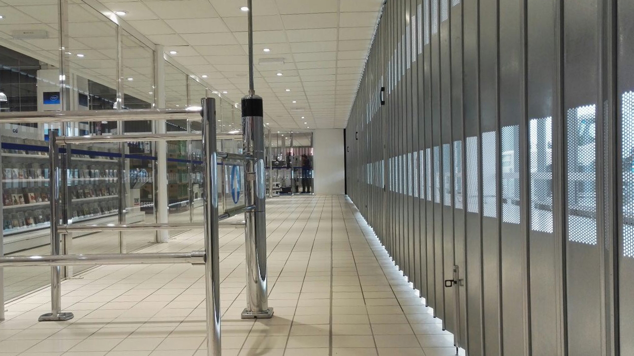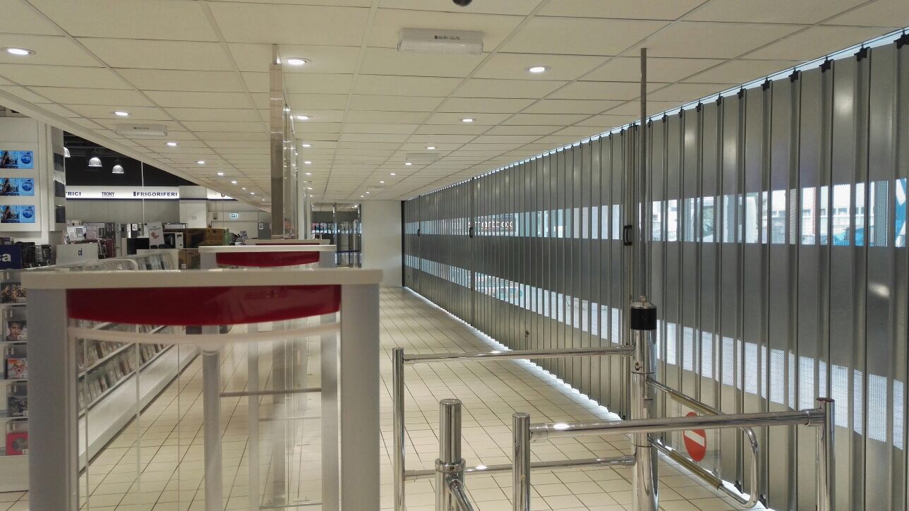 Horizontální skládací žaluzie, ručně ovládaná, mikroperforovaná, z pozinkované oceli.
