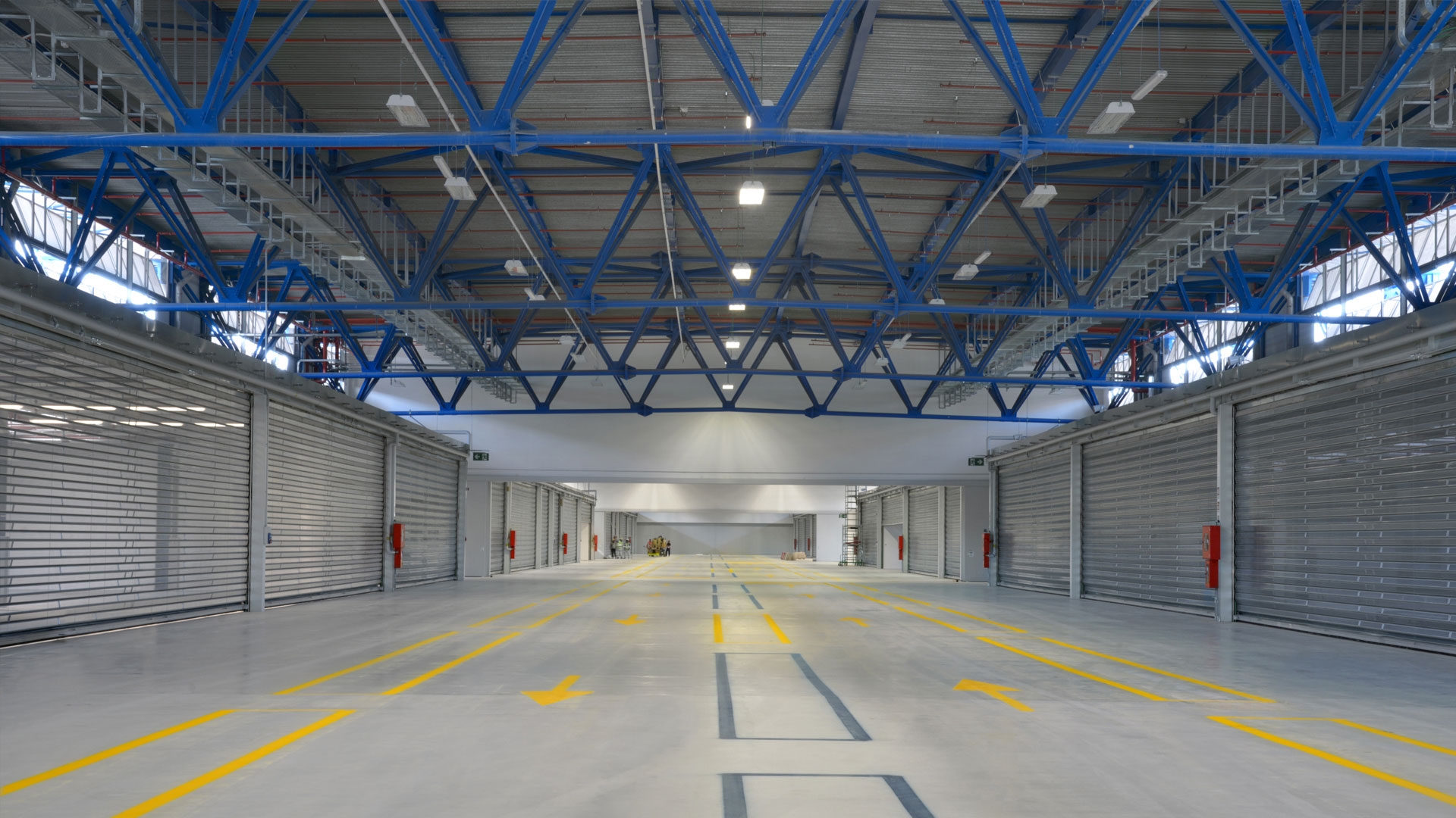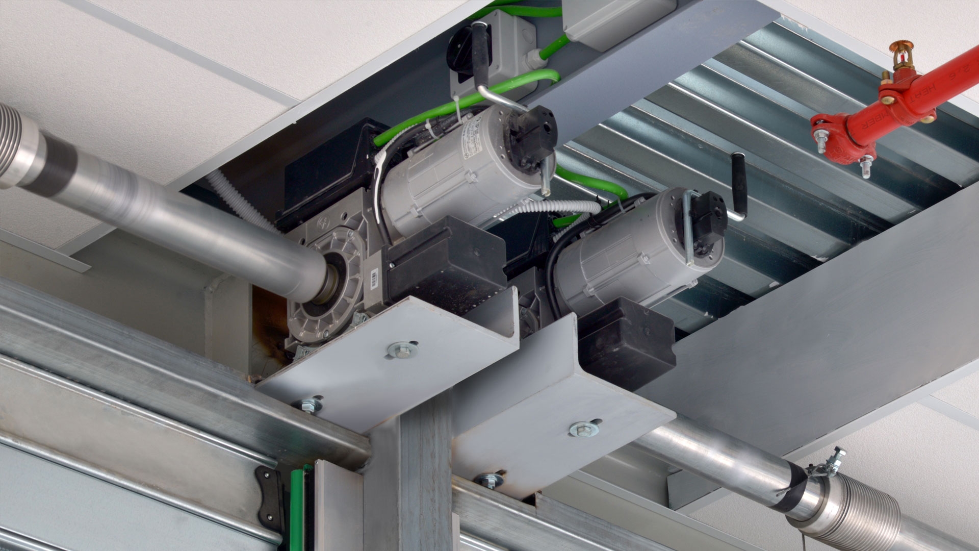 Vertikální skládací žaluzie, elektricky ovládaná, mikroperforovaná, z pozinkované oceli, jediný uzávěr po celé délce průčelí.