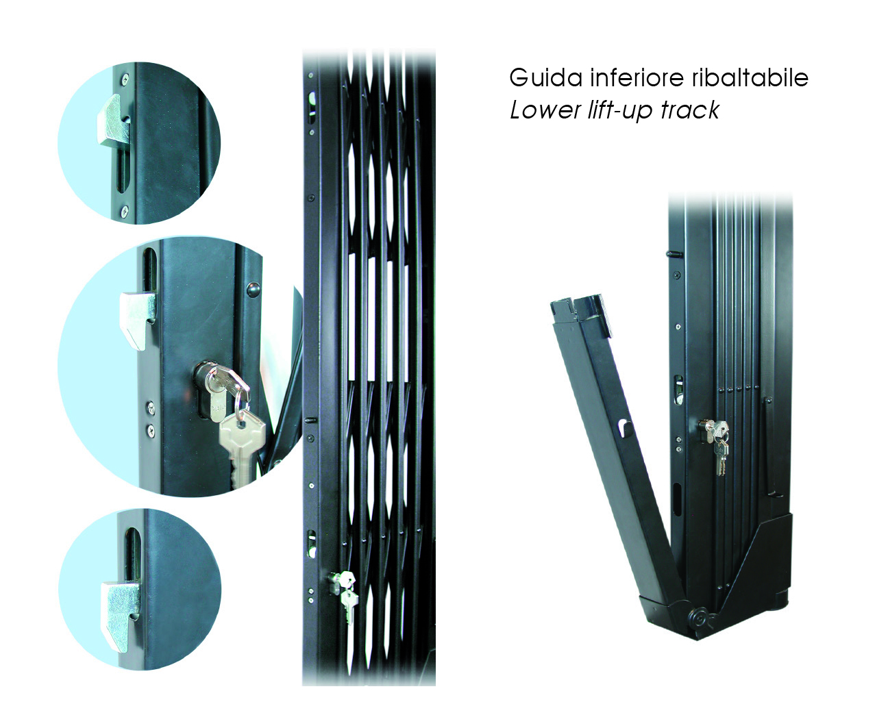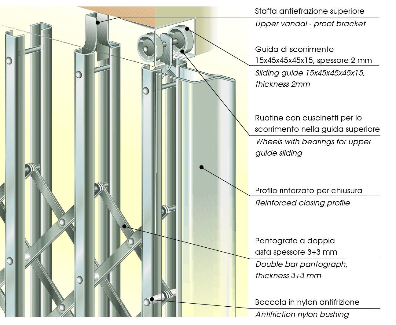 Bezpečné (díky třem uzavíracím bodům), snadno se posunují (dvojitá ložiska nahoře) a zabírají málo místa (v otevřeném stavu asi 15 % šířky otvoru). Skládací brány ISEA se hodí pro libovolnou šířku, jdou namontovat bez zásahu do zdiva a nepřekážejí světlu v chráněném prostoru.