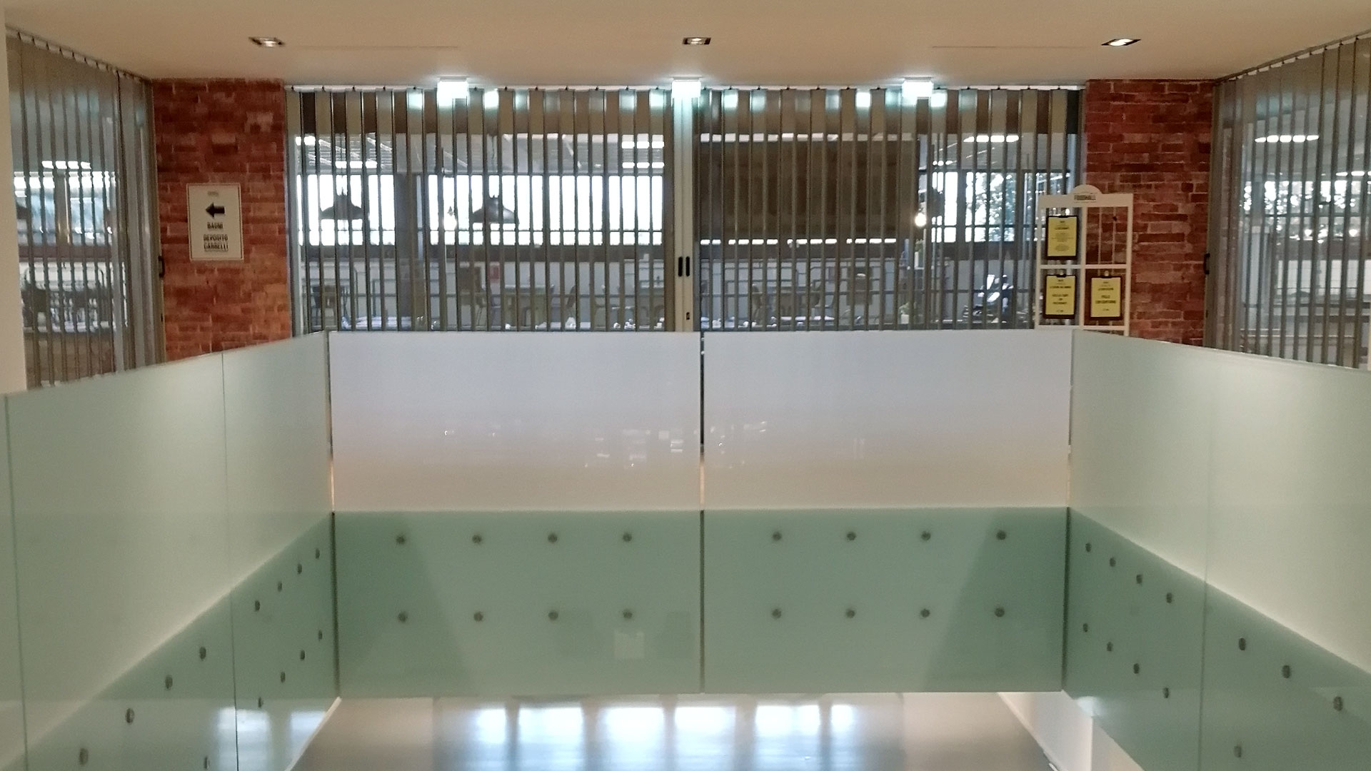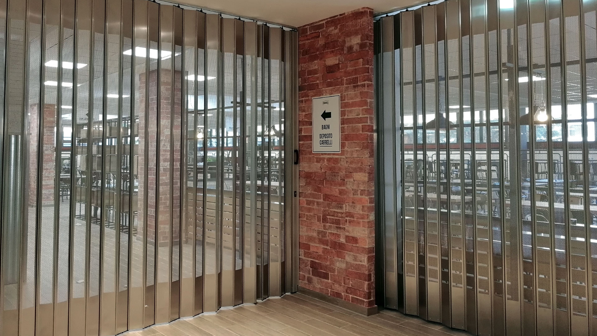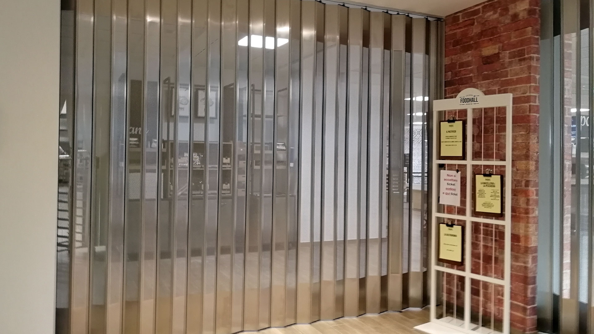 FoldingPACK® Posuvná skládací bezpečnostní žaluzie, realizovaná pro samoobslužnou oblast uvnitř obchodního parku v Miláně. Délka přibližně 8 metrů, lineární posuv s bočním uzávěrem uvnitř dutiny vytvořené ve zdi.