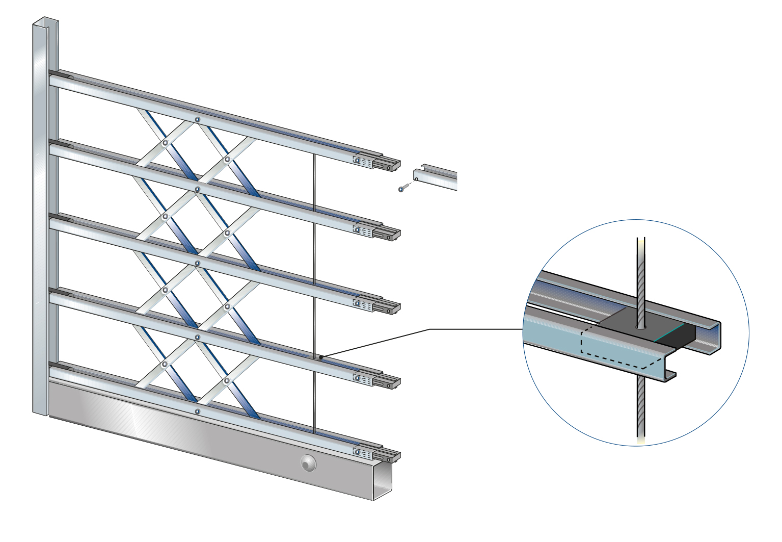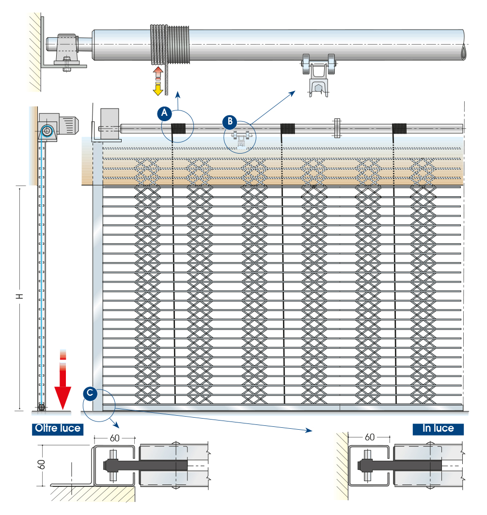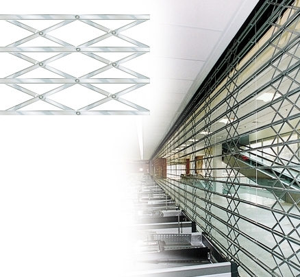 Žaluzie z pozinkované oceli sestávající z dvojitých vodorovných profilů „U“ propojených pantografy.