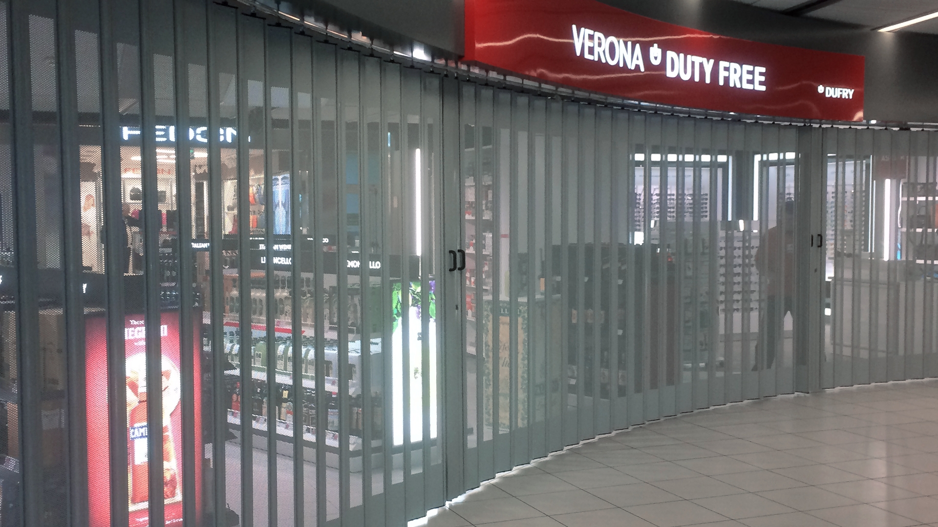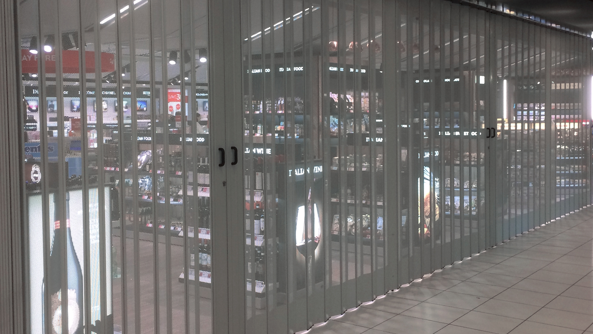 Horizontální posuvná skládací bezpečnostní žaluzie, ručně ovládaná, mikroperforovaná, z pozinkované oceli a hliníku.