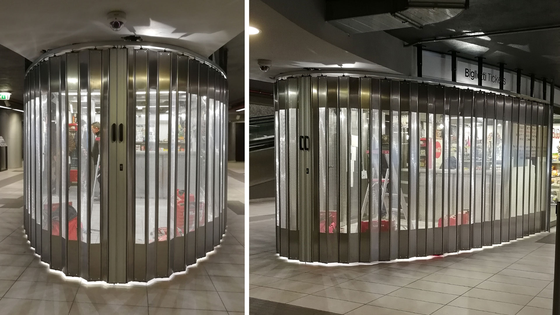 FoldingPACK® horizontální posuv s křivkou, která zcela obepíná kavárnu uvnitř stanice metra Milano Centrale.