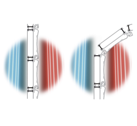 Spojení je provedeno pomocí speciálního mechanického procesu, který zahrnuje vložení n° 2 polyamidových tyčí k získání tepelného mostu mezi n° 2 izolačními prostory.