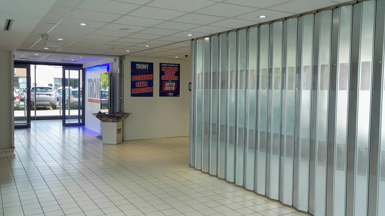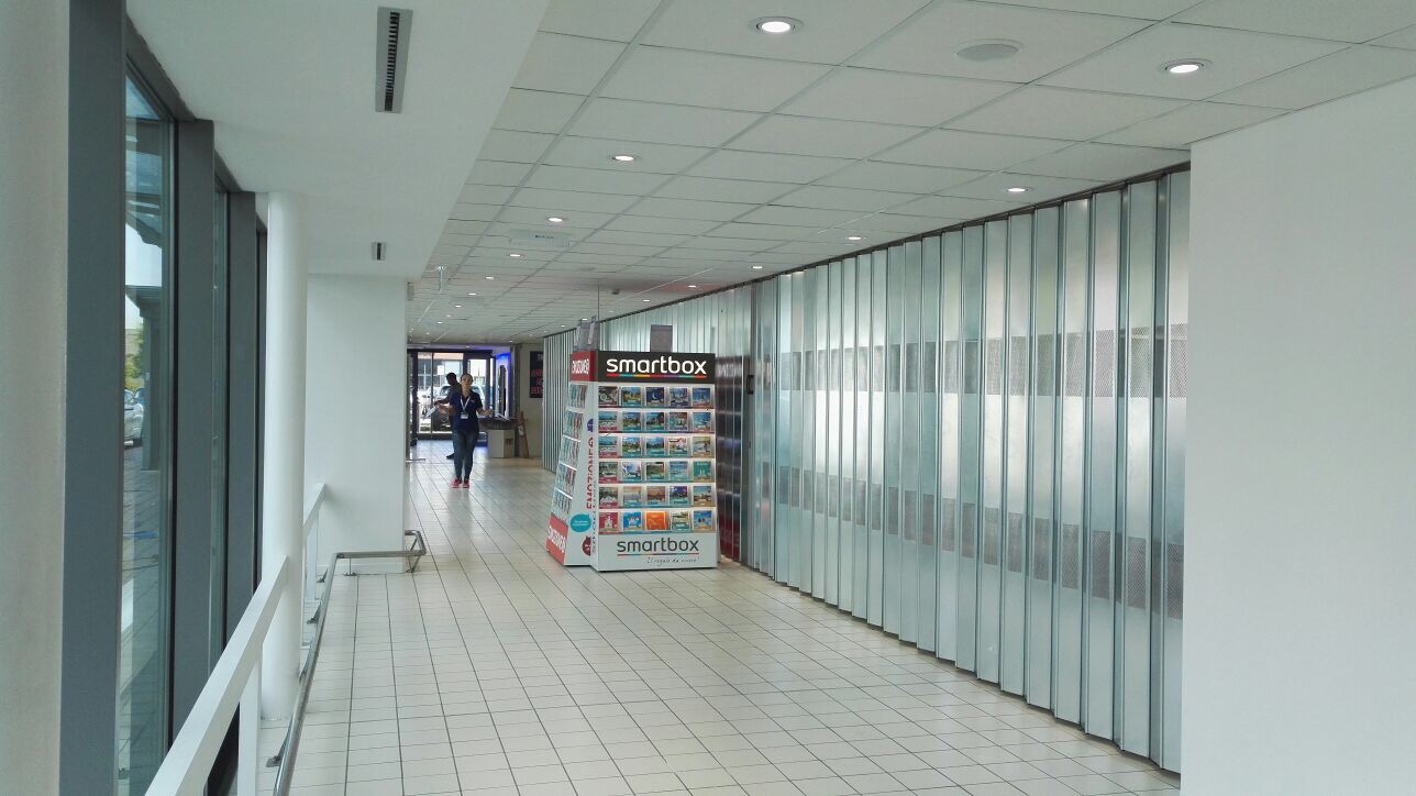 Horizontální skládací žaluzie, ručně ovládaná, mikroperforovaná, z pozinkované oceli.