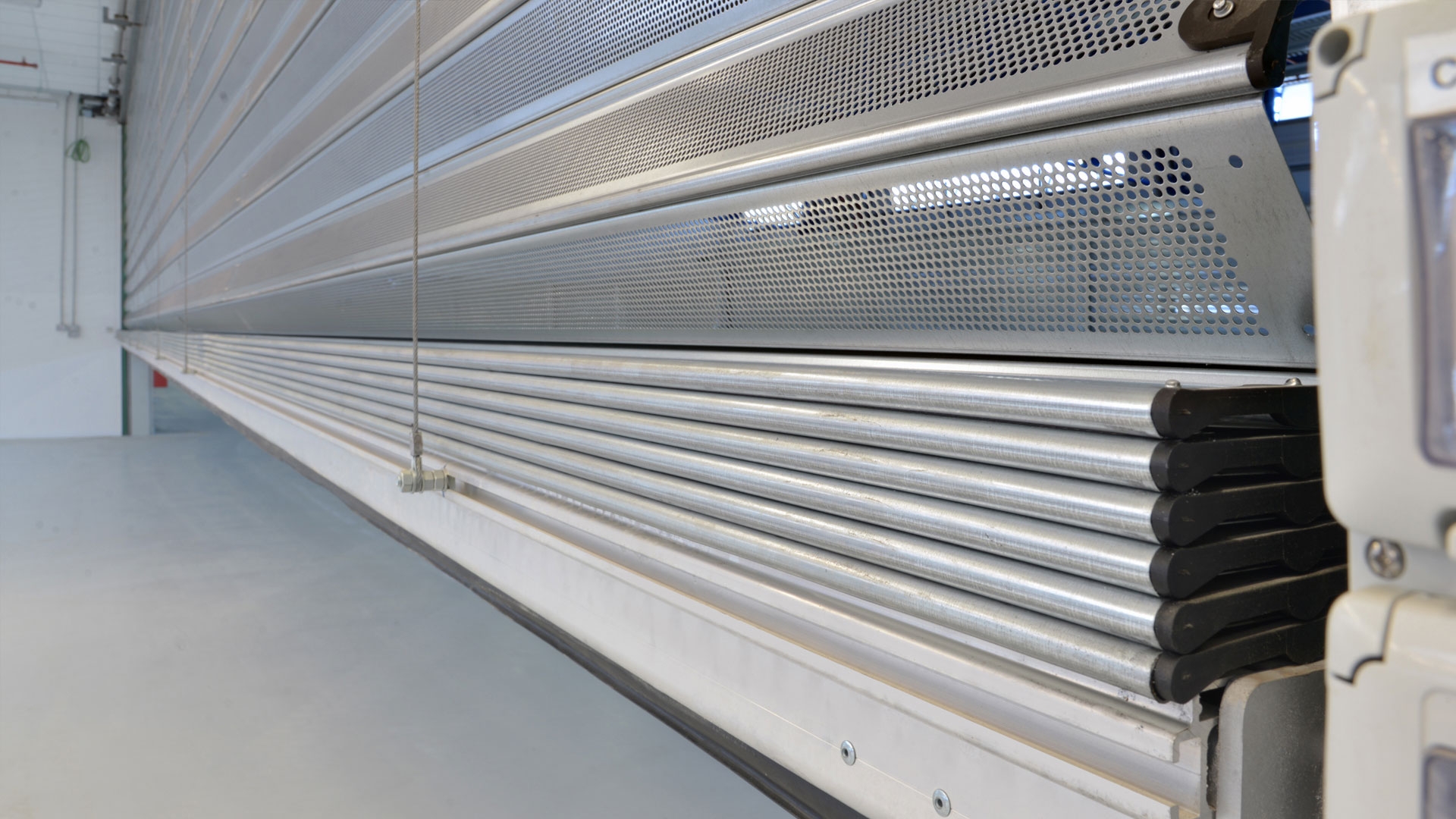 Vertikální skládací žaluzie, elektricky ovládaná, mikroperforovaná, z pozinkované oceli, jediný uzávěr po celé délce průčelí.