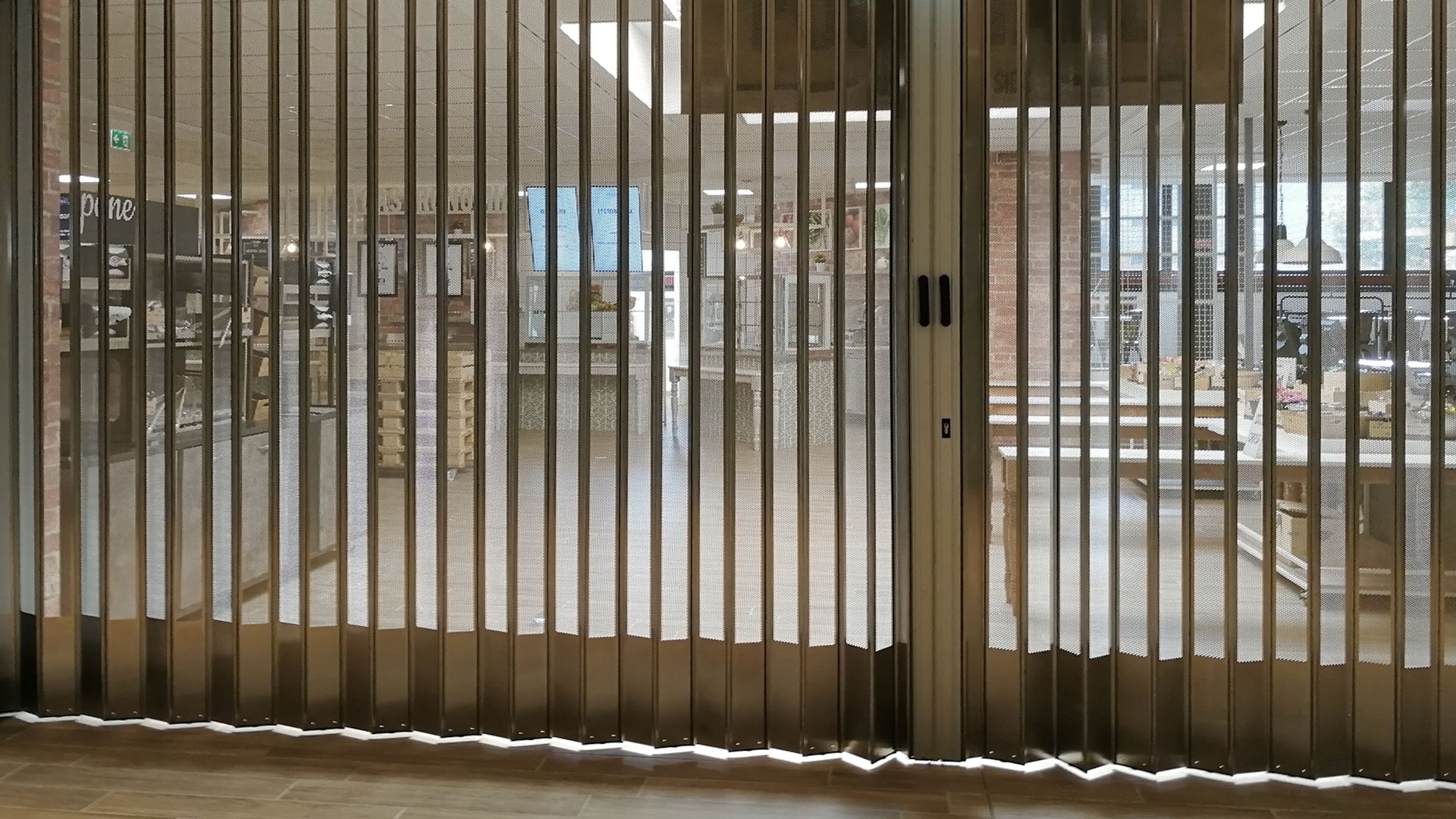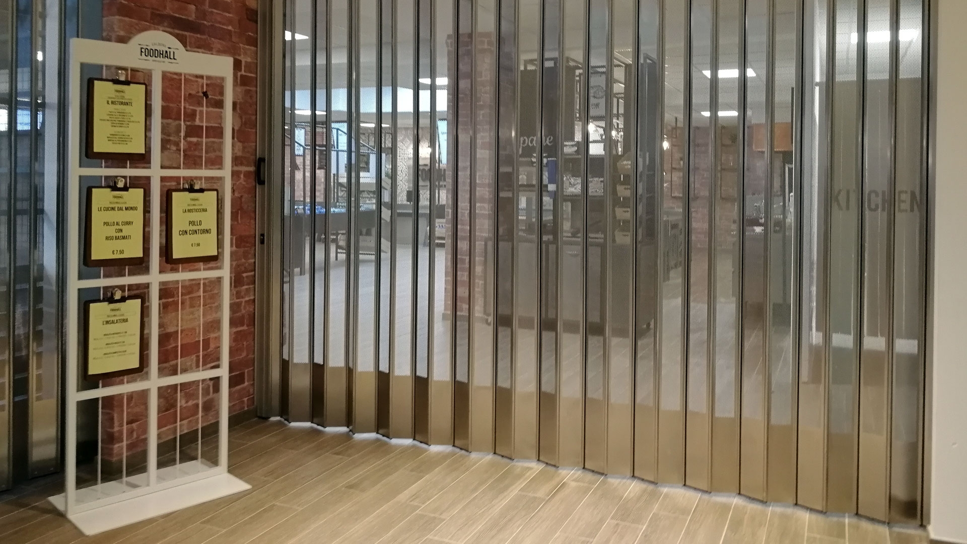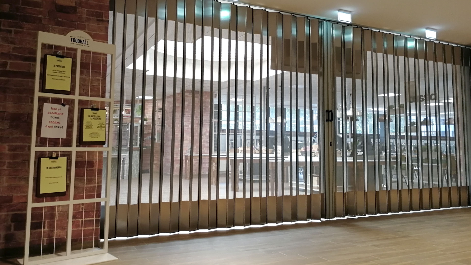 FoldingPACK® Posuvná skládací bezpečnostní žaluzie, realizovaná pro samoobslužnou oblast uvnitř obchodního parku v Miláně. Délka přibližně 8 metrů, lineární posuv s bočním uzávěrem uvnitř dutiny vytvořené ve zdi.
