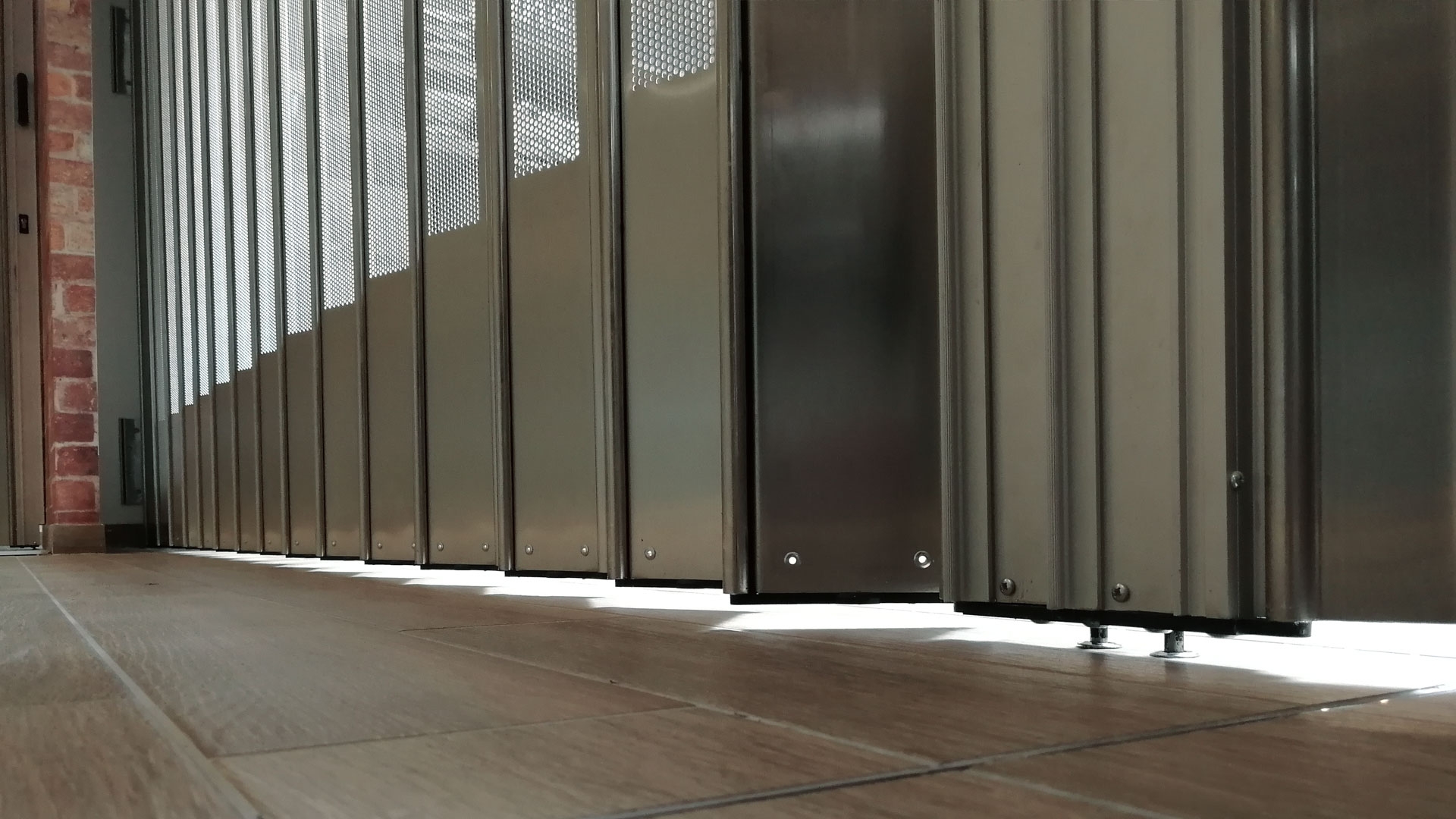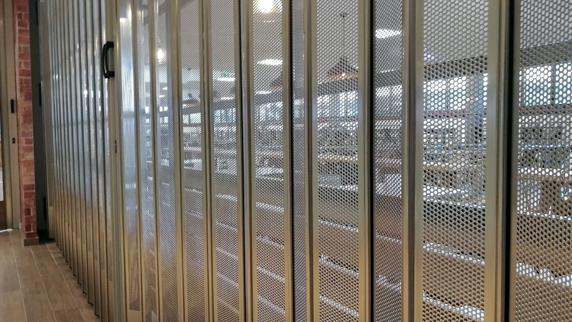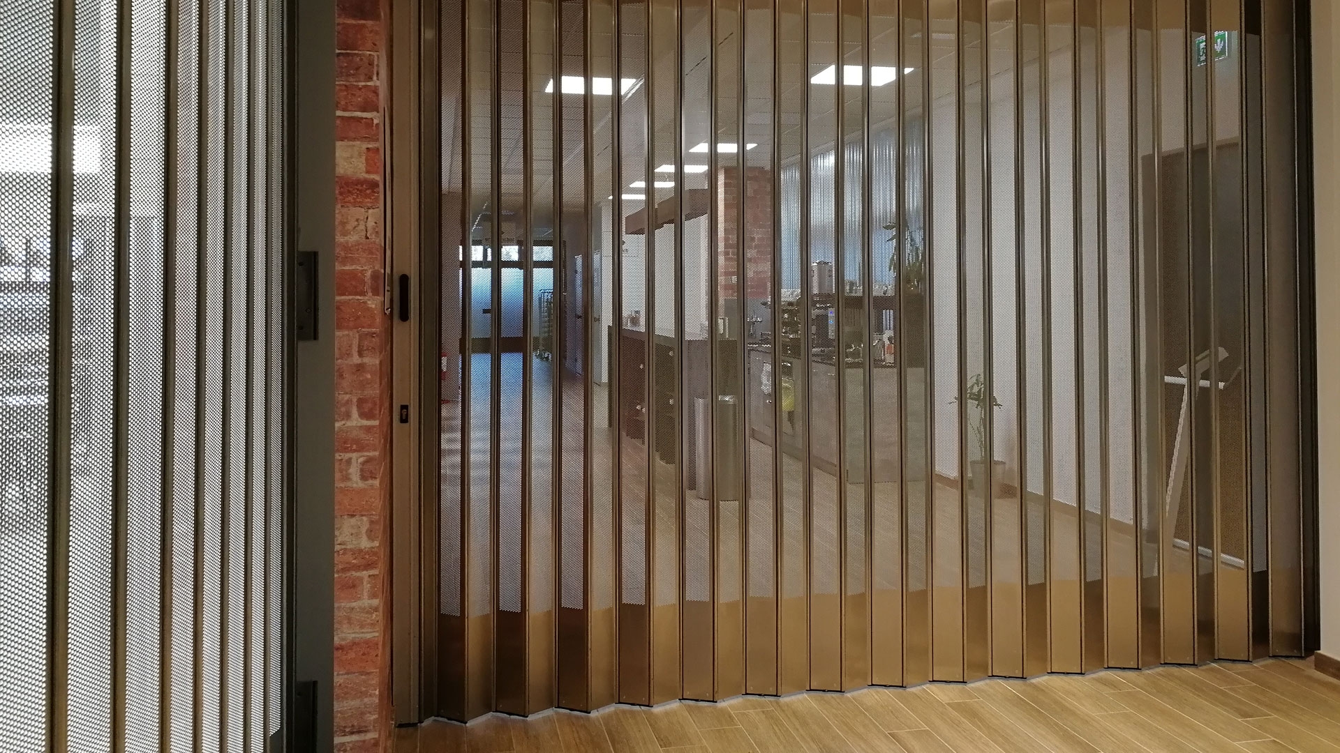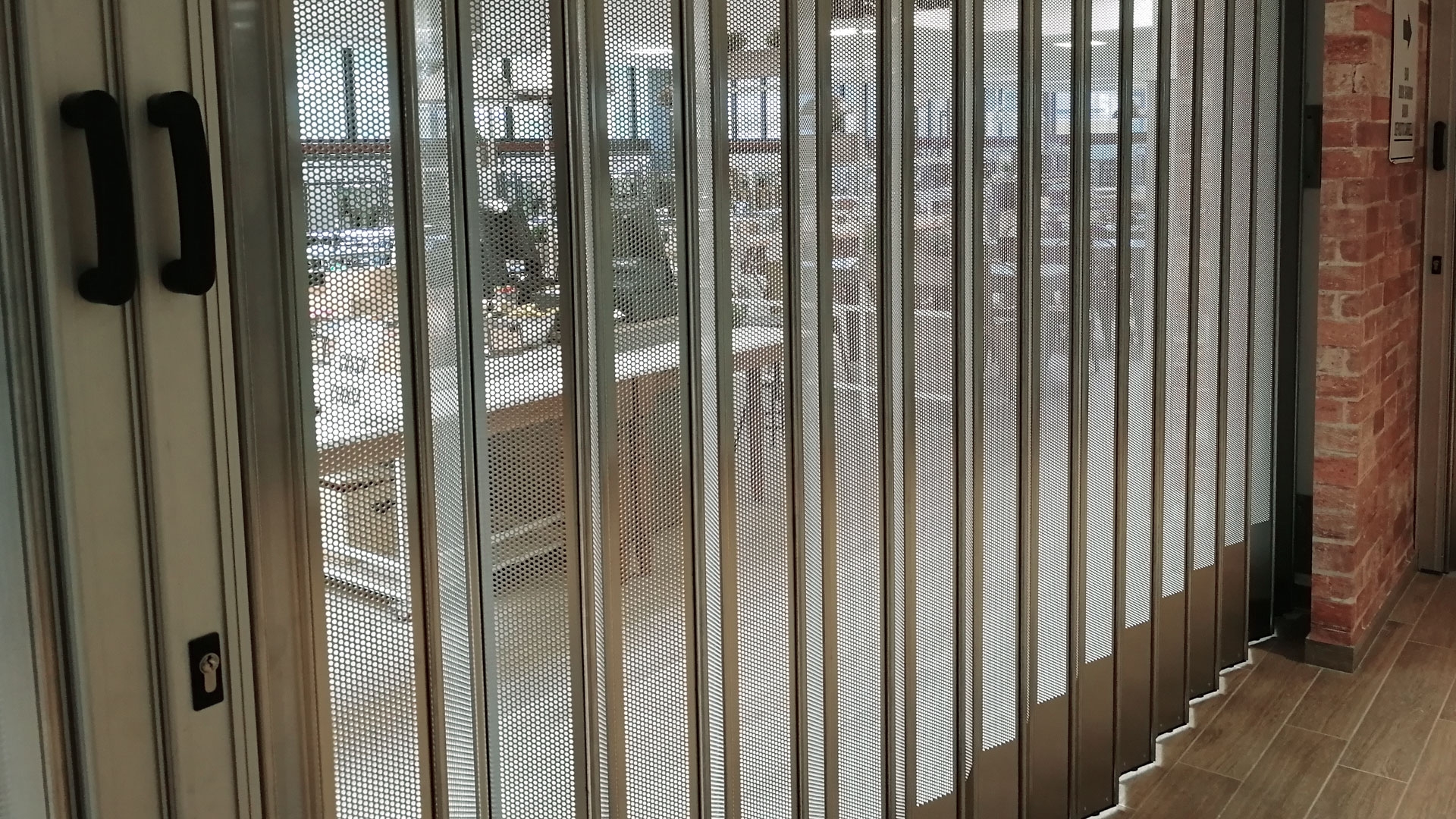 FoldingPACK® Posuvná skládací bezpečnostní žaluzie, realizovaná pro samoobslužnou oblast uvnitř obchodního parku v Miláně. Délka přibližně 8 metrů, lineární posuv s bočním uzávěrem uvnitř dutiny vytvořené ve zdi.