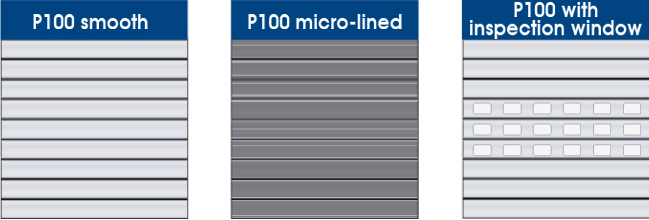 Smooth or micro lined roller shutter with the possibility to apply small windows in transparent polycarbonate.