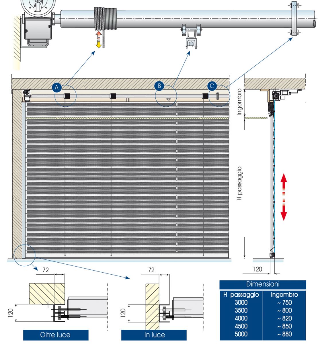 The operation is granted by a sole gear motor. The main shaft is supported by supports equipped by self lubricated bearing in all its length; the opening/closure operations are integrated by winding shaft and steel cables. The pairing shaft/cable/gear motor make the operations easier and dynamic safe.